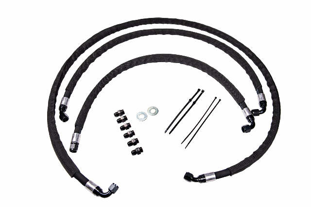 Replace your leaking transmission lines with our heavy duty, high flow, flexible transmission lines. Our kit is the most complete replacement transmission line kit available for your L5P truck! With an increased diameter over stock and heavy duty hose wrap, these lines will increase overall flow and protect against future failures. Kit Includes: (3) 5/8" ID transmission lines with AN fittings (6) 7/8"-14 O-ring to -10AN fittings (2) Large OD washers Double hose clamps, locking cable ties, and fir tree cable clamps Features: Increased diameter over stock - 5/8" hose Explosion proof polyester hose protection sleeve Application Notes: Not for use on Cab and Chassis applications