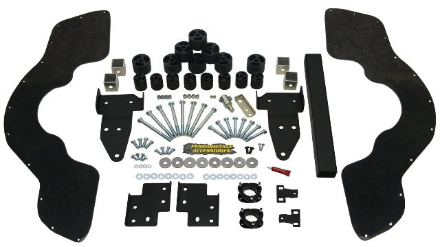 Performance Accessories PLS990 Premium Lift System raises the vehicle 4-inches, by combining the companys high-quality body-lift and leveling kit, allowing the vehicle to run up to a 35-inch diameter tire. The kit includes 1.75-inch high-quality front urethane spacers, high pressure fiberglass reinforced nylon lift blocks a CNC machined and zinc plated steering extension, high strength hardware and urethane wheel-well extensions (Gap Guards) that conceal any gaps between the body and frame. This system can be installed in 4 hours and comes complete with everything necessary for installation. Read Our Article On How To Install This Kit Benefits: Provides 4-inches of lift without modifying existing suspension components. Allows use of up to 35-inch diameter tires for improved ground clearance. Allows use of factory wheels after installation for convenience. DOES NOT alter the OEM suspension geometry or factory Stability parameters. Maintains the factory smooth ride. Keeps the jeeps center of gravity lower than a comparable suspension lift. Features: High quality front urethane coil spring spacers Fiberglass reinforced nylon body blocks CNC machined & zinc plated steering extension High strength hardware included Includes urethane Gap Guard wheel well extensions Made in the U.S.A.