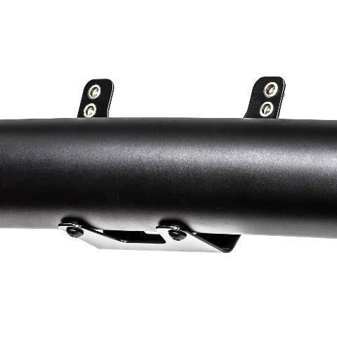 Relocates license plate. Bolts directly to ultimate and e-series bar. Black powder coated steel bracket. Hardware is included.