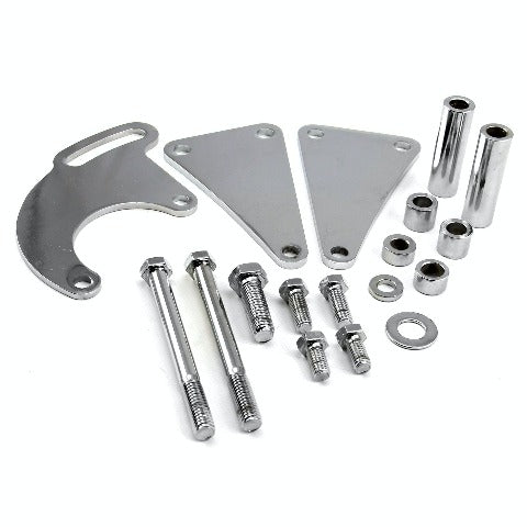 PCE universal power steering pump brackets mount GM self-contained power steering pumps low on the block for a compact installation and good looks. They are available for small and big block Chevys. Use existing bolt holes to mount these brackets with the included hardware.