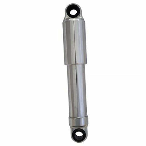 Polished Hot Rod Shock, 3.3" stroke with shaft cover, universal. Includes 1 eye/eye shock with 7/16", 1/2" and 5/8" I.D. sleeves. 7.9" x 11.2" with a 9.75"-10" ride height.