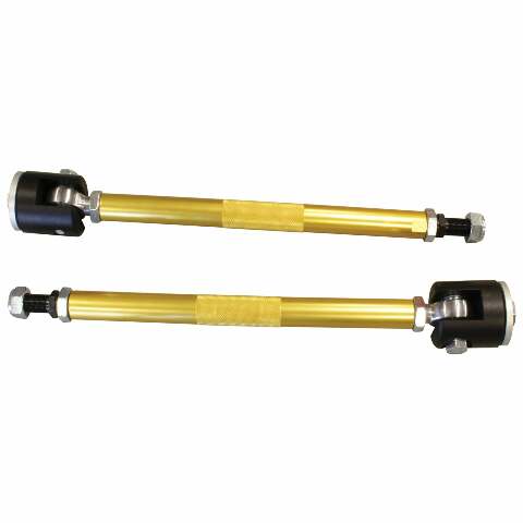 These bars are fully adjustable and come with rod ends. They are anodized and constructed of 6061-T6 Aluminum. No bushings are required. They are a direct bolt-in for an aftermarket or factory K-Member replacement.