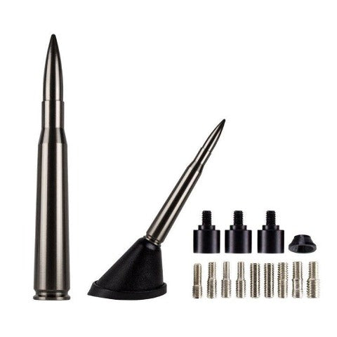New line of Ammotenna automotive antenna replacement masts! 0.50cal, 0.30cal, 7.62 mm and arrow styles. Each Ammotenna mast is made from 6061 billet aluminum. Multiple adapters are included to Fit most applications including the new Jeep 5/16th thread. Every kit includes a rubber grommet that will help keep moisture out. Each round comes in a wide range of finishes: brass, billet, carbon fiber, gun metal, and anodized black. We also have hydro dipped finishes in some popular designs such as: muddy girls, wildfire, Kryptek, digital camo, the US flag and more. Each antenna CAN easily be mounted on fender and roof applications. Most installations do not require any tools, on some just an adjustable wrench is all that is needed. Optimized for optimum reception of the FM band. With our short antenna, no more worrying about hitting low hanging brush, drive-thru or garage doors. Customize the look of your ride and make a bold statement with Ammotenna replica bullet antennas. Designed for AM/FM radio bands and work with vehicles with removable antenna masts. Multiple adapters included to fit different makes and models. 30. caliber bullet antenna in gun metal finish for a unique look.