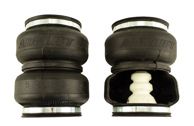LoadLifter 5000 ULTIMATE adjustable air spring kits feature all of the benefits of our heaviest rated air spring with the addition of an internal jounce bumper inside the spring for the ultimate in ride comfort. An Air Lift exclusive product! Fits vehicles with in-bed hitches. Tow and haul the heaviest loads with safety and comfort with LoadLifter 5000 ULTIMATE. Works with vehicle's leaf springs to provide up to 5,000 lbs. of rear load leveling capacity and keeps the vehicle riding stable, level and comfortable whether loaded or unloaded. Fully adjustable from 5 to 100 PSI. The closed-cell urethane foam jounce bumper inside the ULTIMATE air springs provide a cushion of air that absorbs shock, eliminates harsh jarring on rough roads and protects vehicles carrying heavy loads. Never bottom out again with the ULTIMATE! LoadLifter 5000 ULTIMATE air springs are maintenance free! Safely run with zero air pressure because of the internal jounce bumper. Replaces factory jounce bumper that is sometimes removed when adding air springs. Easy to install in less than 2 hours. Requires no drilling into frame! Includes industry-exclusive 60 Day No Questions Money Back Guarantee! Includes the most comprehensive Lifetime Warranty in the industry---covers all kit contents including brackets, fittings and air line. Air springs are built like a tire and are reinforced by durable, 2-ply fabric for maximum strength. Exclusive upper and lower roll plates included. Protect the springs from sharp edges, such as brackets or the frame. They increase load capacity up to 10%. The kit includes 2 air springs, brackets, air lines, Schrader valve and all of the hardware needed for installation. Includes fully illustrated instruction manual. Add an Air Lift on-board air compressor system to inflate and deflate air springs with the touch of a button from inside or outside of the vehicle.