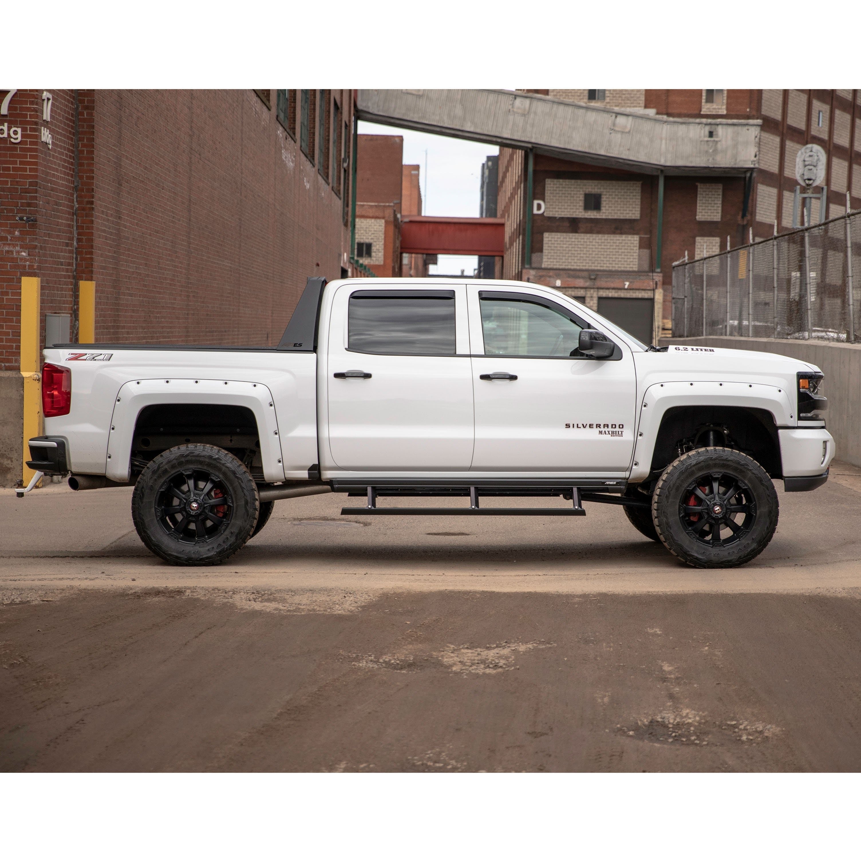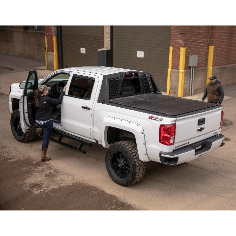 The ARIES Switchback headache rack is an aggressive, off-road-style truck headache rack that features rust-free construction, an LED-compatible top edge and a patented installation system -- all to make sure your truck not only stands out on the road, but also has the backbone to tackle the trail. The Switchback truck headache rack is built with all-aluminum construction, meaning you will never have to worry about rust. Aluminum offers solid strength while helping to keep your truck lightweight. The aluminum alloy is also protected with a highly durable carbide black powder coat finish that maximizes corrosion resistance and adds a sleek finishing touch. The Switchback is built to readily accept aftermarket lighting. Its top edge is a slotted channel that accepts LED light bars or work lights. Three 10" LED light bars (ARIES #1501260) are recommended. The slotted channel allows for easy installation of the lights and adjustable positioning. Installing the ARIES Switchback aluminum headache rack couldn't be easier with our patented mounting system. It features unique stake pocket anchors that requires no drilling or complicated procedures. Simply drop it in, tighten a single bolt on each side, and you're ready to hit the trails. The Switchback also features a three-piece assembly, making it easier to ship, and allowing you to mount the headache rack without the center section for easy access to the rear cab window. Each ARIES Switchback headache rack is designed for vehicle-specific installation for a custom fit. This particular model fit specific years of the Chevy Silverado 1500, 2500 HD or 3500 HD and GMC Sierra 1500, 2500 HD or 3500 HD (see application info to verify fitment). Brackets and mounting hardware are included.
