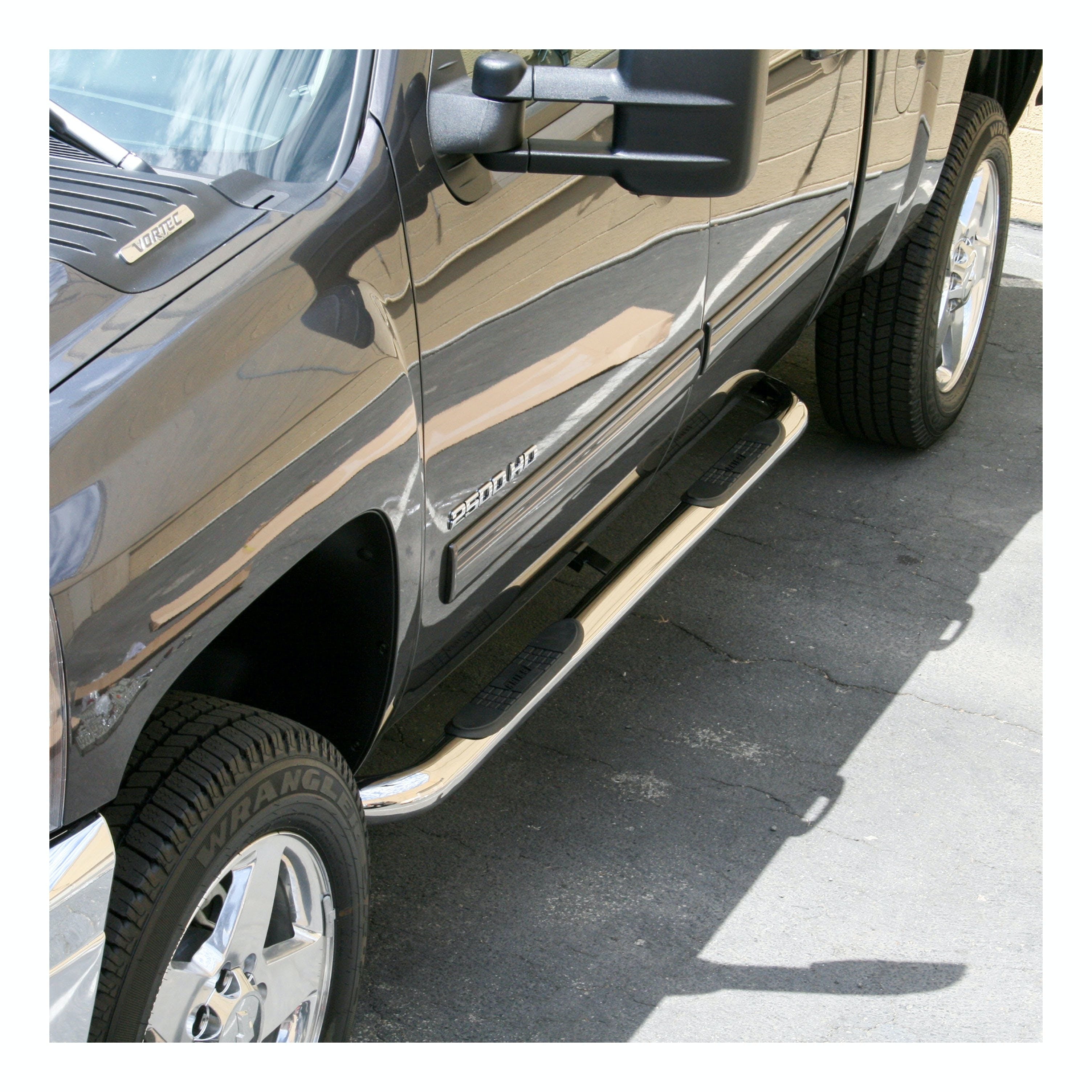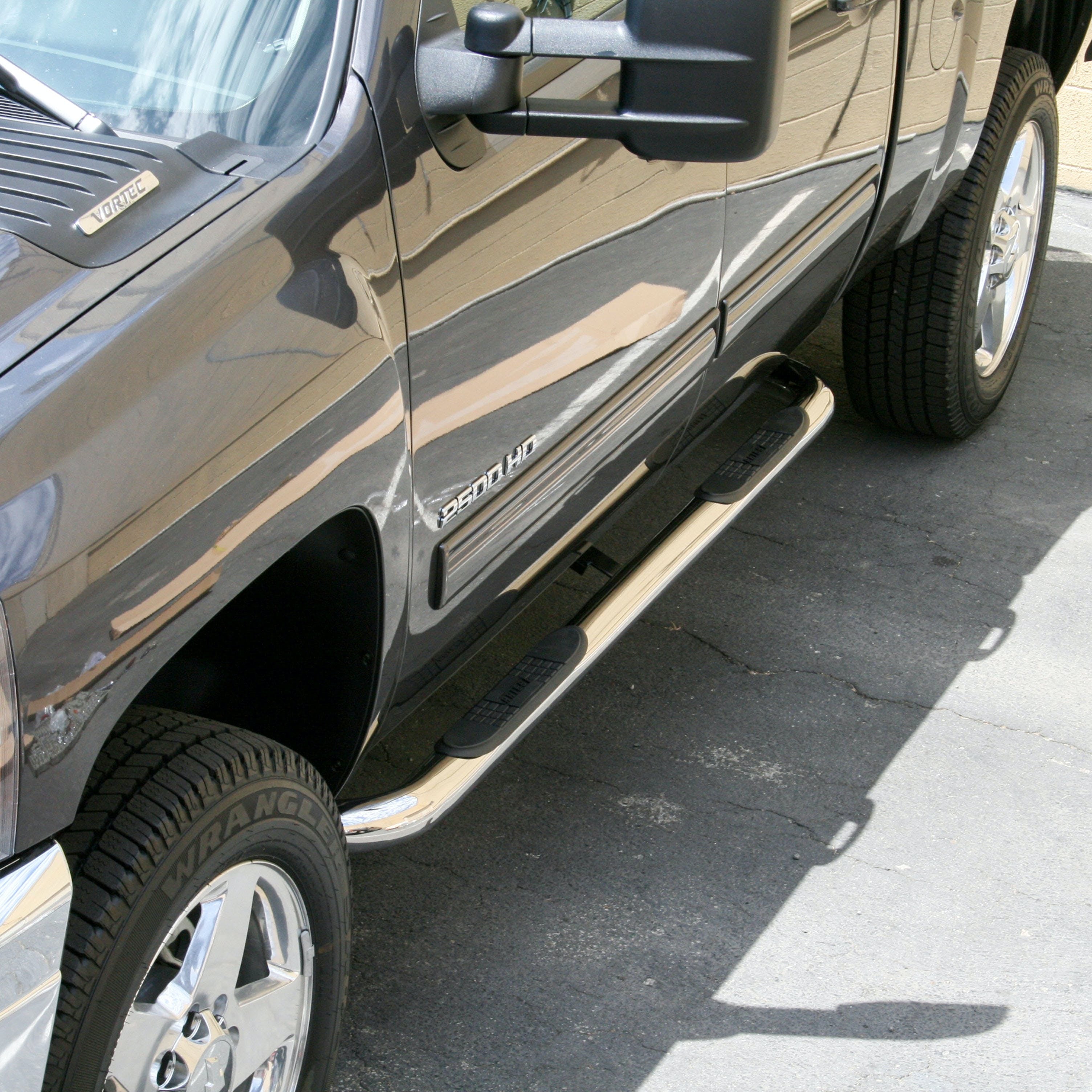 ARIES 3" side bars add a custom look and dependable footing to your truck, Jeep or SUV. They feature a classic style, a strong design and non-skid step pads. ARIES nerf bars are all made vehicle-specific for a custom, no-drill fit, and they are available in multiple finish options. This set of nerf bars is constructed from 304 stainless steel with a polished finish. Our 304 stainless steel is a true stainless with high nickel content, offering better corrosion resistance and a long-lasting finish. The polish is a triple application, resulting in a mirror-like shine to complement your vehicle. ARIES 3" round side bars also come with high-strength steel brackets and non-skid step pads. The mounting brackets -- as well as the side bars and step pads -- are custom-designed for specific makes and models to allow the nerf bars to contour to the lines of your vehicle. This ensures easy, no-drill installation and the strength necessary to provide solid footing. This particular set of custom nerf bars fits specific years of the Chevy Silverado 1500, 1500 HD, 2500 HD, 2500 HD Classic or 3500 HD and GMC Sierra 1500, 1500 HD, 2500 HD or 3500 HD (see application info to verify fitment). ARIES 3" round side bars also come with non-skid step pads made of polypropylene. These wide, custom-positioned step pads feature a textured pattern and cover a wide portion of the tubes to be more comfortable and high-traction, even in wet conditions.