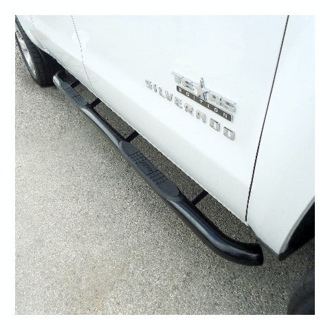 ARIES 3" side bars are more than a fancy decal for your truck, Jeep or SUV. They are a confident first step on each new adventure. These 3" nerf bars are constructed from strong carbon steel for superior rigidity, and they feature a sleek semi-gloss black powder coat finish. For an added edge, each nerf bar also goes through an E-coat process, before receiving its black powder coat, to strengthen and protect the final finish against peeling, chipping and scratching. ARIES 3" round side bars are also available in polished stainless steel or semi-gloss black powder-coated steel. All ARIES 3" nerf bars come with heavy-duty steel brackets and non-skid step pads. The mounting brackets are strong and custom-designed for specific makes and models to allow the side bars to contour to the lines of your vehicle. They offer easy installation and the strength necessary to provide sound footing. These particular custom nerf bars fit specific years of the Chevy Silverado 1500, 2500 HD, 2500 HD Classic or 3500 HD and GMC Sierra 1500, 2500 HD or 3500 HD (see application info to verify fitment). ARIES 3" round side bars also come with non-skid step pads made of tough polypropylene. These step pads feature a textured pattern for enhanced safety, and they cover a wide portion of the tubes for a more comfortable step.