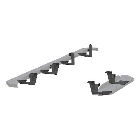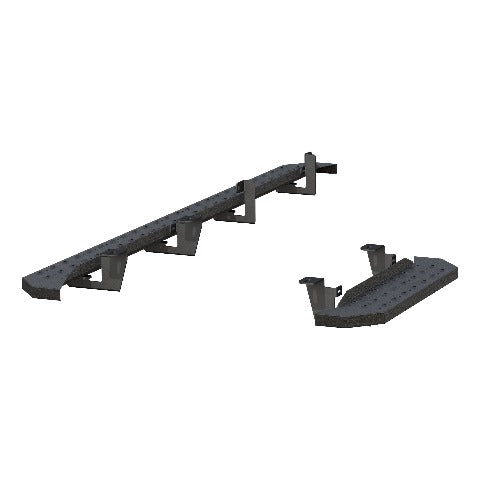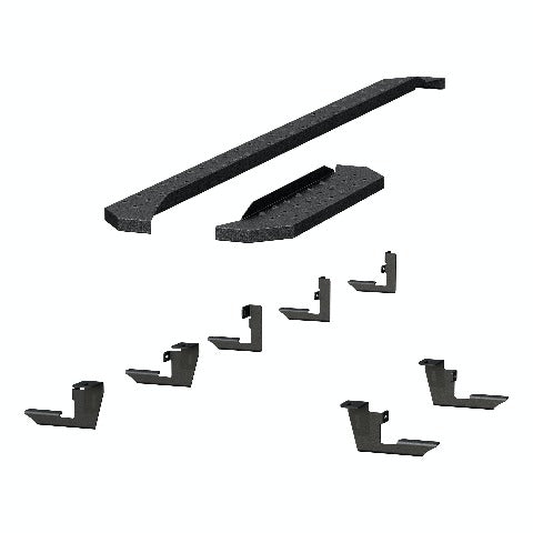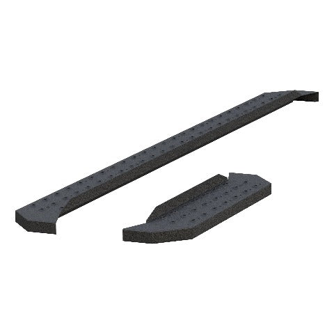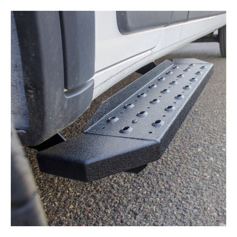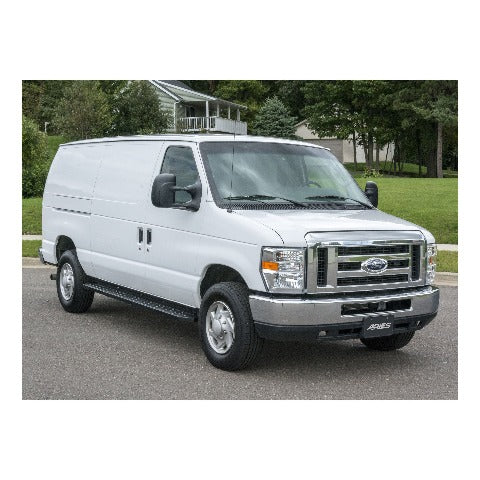 Powerful, definitive and uncompromising as a mountain ridge, ARIES RidgeStep running boards are made for those who gets it done, day after day. With their solid, all-steel construction, non-skid treads and tough powder coat finish, RidgeStep running boards are made to finish the job. Installation of these running boards is easy and secure because they use the ARIES VersaTrac mounting system. The underside of each board is equipped with a channel that accepts a set of heavy-duty bracket inserts. The inserts move along the channel to fit your cargo van, and the mounting hardware provides a secure attachment. These running boards are designed to fit specific years of the Ford E-150, E-150 Econoline, E-250, E-250 Econoline and E-350 Super Duty (NOTE: This set of running boards includes vehicle-specific VersaTrac mounting brackets. See the application information to verify compatibility with your vehicle). ARIES RidgeStep running boards are not only made for easier installation, but they are also built to face the harsh elements of the commercial job. They feature high-strength, solid steel construction for a step that can keep up with those steel-toe boots, and they are completely without plastic parts, meaning they will not crack or fade over time. Their stamped, all-steel tread offers a 6-1/2" wide, non-skid surface that will never wear down no matter how many times you climb in and out of your work van. The end caps are also made from steel and are welded to contour to the body of your van for a professional finish. RidgeStep running boards come with a unique E-coat and textured black powder coat finish to not only withstand rust but also to hide minor scratches and grime.