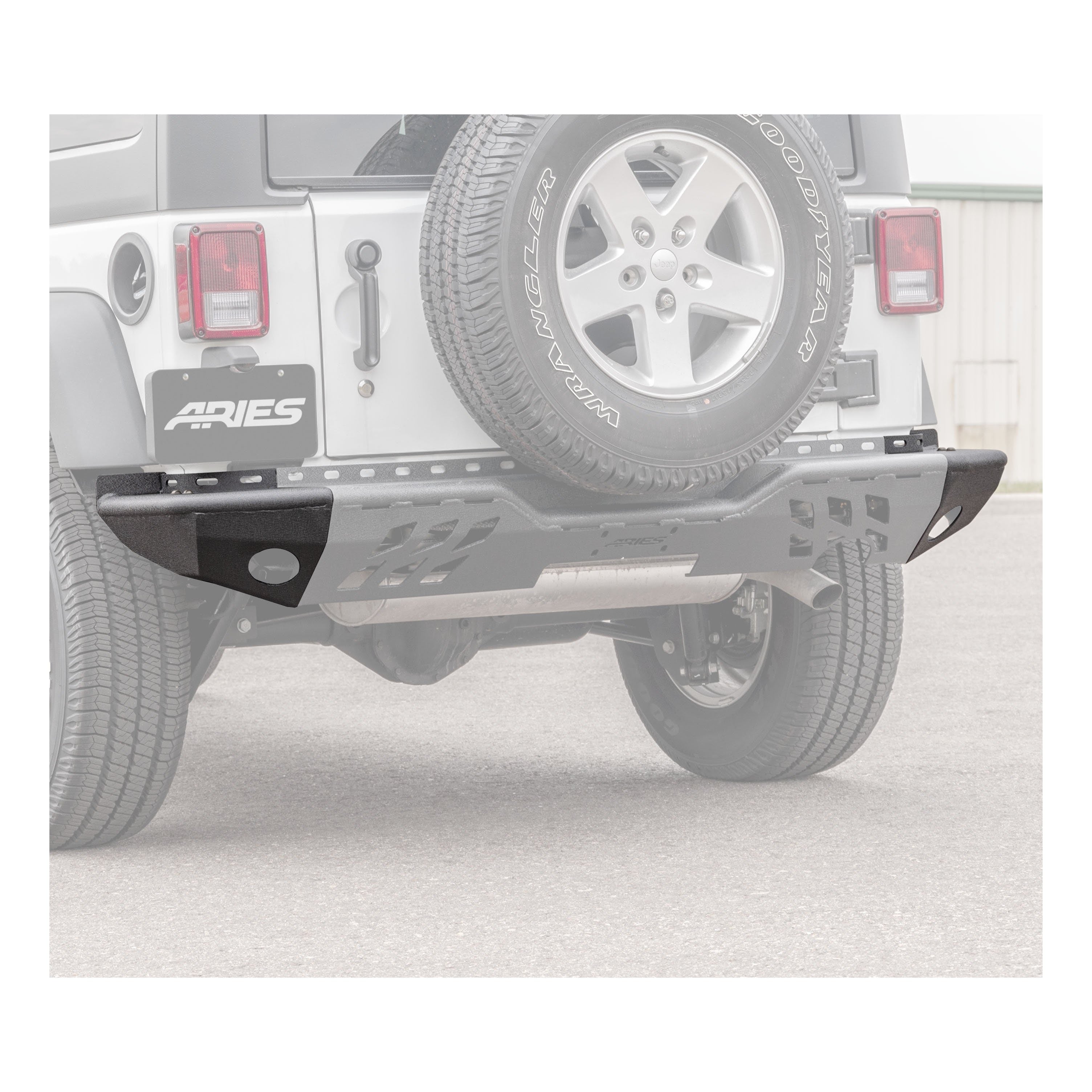 The ARIES TrailChaser Jeep bumper is unlike any other bumper for the Jeep Wrangler because it features a modular design. Each piece can be attached or swapped out as desired, giving you complete freedom of customization. This particular package includes the rear corners only. These two corners are intended to be mounted on the TrailChaser rear bumper center section (sold separately). They offer a bold finishing touch with an aggressive cutout and mounting points for additional lights. These side extensions are constructed from T6 aluminum alloy to be strong, lightweight and rust-free, and have a unique, textured black powder coat finish for maximum corrosion resistance. They are also available in powder-coated steel.