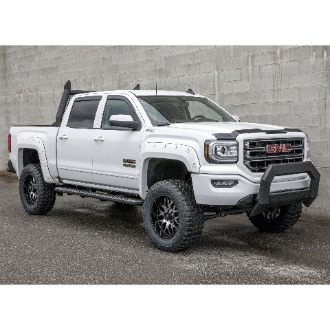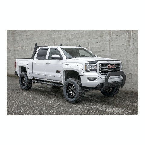 The ARIES AdvantEDGE bull bar sets itself apart with a modern, angular design and all-aluminum construction. It features a track system for mounting auxiliary lights, vehicle-specific mounting brackets and is available in two finish options, allowing you to choose the look that perfectly matches your vehicle. Designed to complement the style of today's pickup trucks, the AdvantEDGE bull bar is as bold as it is tough. Instead of the common, rounded frame of most bull bars and grille guards, AdvantEDGE features a unique, 5-1/2" wide, eight-sided tube profile. Not only does the angled frame better accent the design of modern trucks, but it also offers a strong build. Like the AdvantEDGE headache rack and AdvantEDGE side bars, the AdvantEDGE bull bar is made entirely from aluminum, allowing it to be lightweight and rust-free. The tubular frame is also protected by a durable finish of carbide black powder coat or chrome powder coat. Each AdvantEDGE bull bar is fitted with a textured black aluminum cover plate on the crossbar, making it even more unique. The crossbar can be flipped to expose a track system for mounting LED light bars, work lights or other aftermarket lighting options. It is also available with integrated, flush-mount LED lights. Because each application is made for a custom fit, installation of the AdvantEDGE bull bar is simple and secure. It uses a track mounting system and vehicle-specific brackets to bolt onto pre-existing factory holes in the vehicle's frame. This speeds up installation and offers maximum rigidity. This particular AdvantEDGE bull bar is designed to fit specific years of the Chevy Silverado 1500 and GMC Sierra 1500, 1500 Classic or 1500 HD Classic (see application info to verify fitment). The AdvantEDGE bull bar is made to complement our AdvantEDGE side bars and AdvantEDGE headache rack, giving you a complete look for your truck and a style unlike any other.