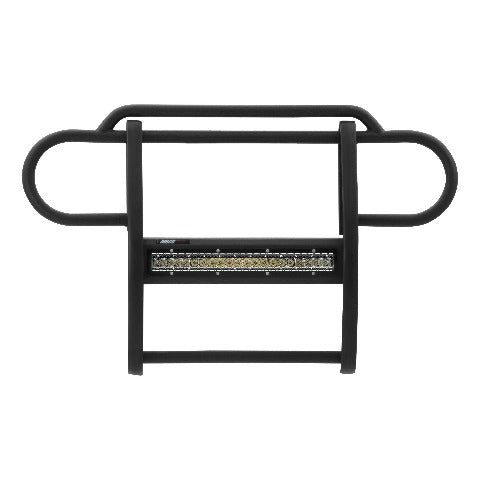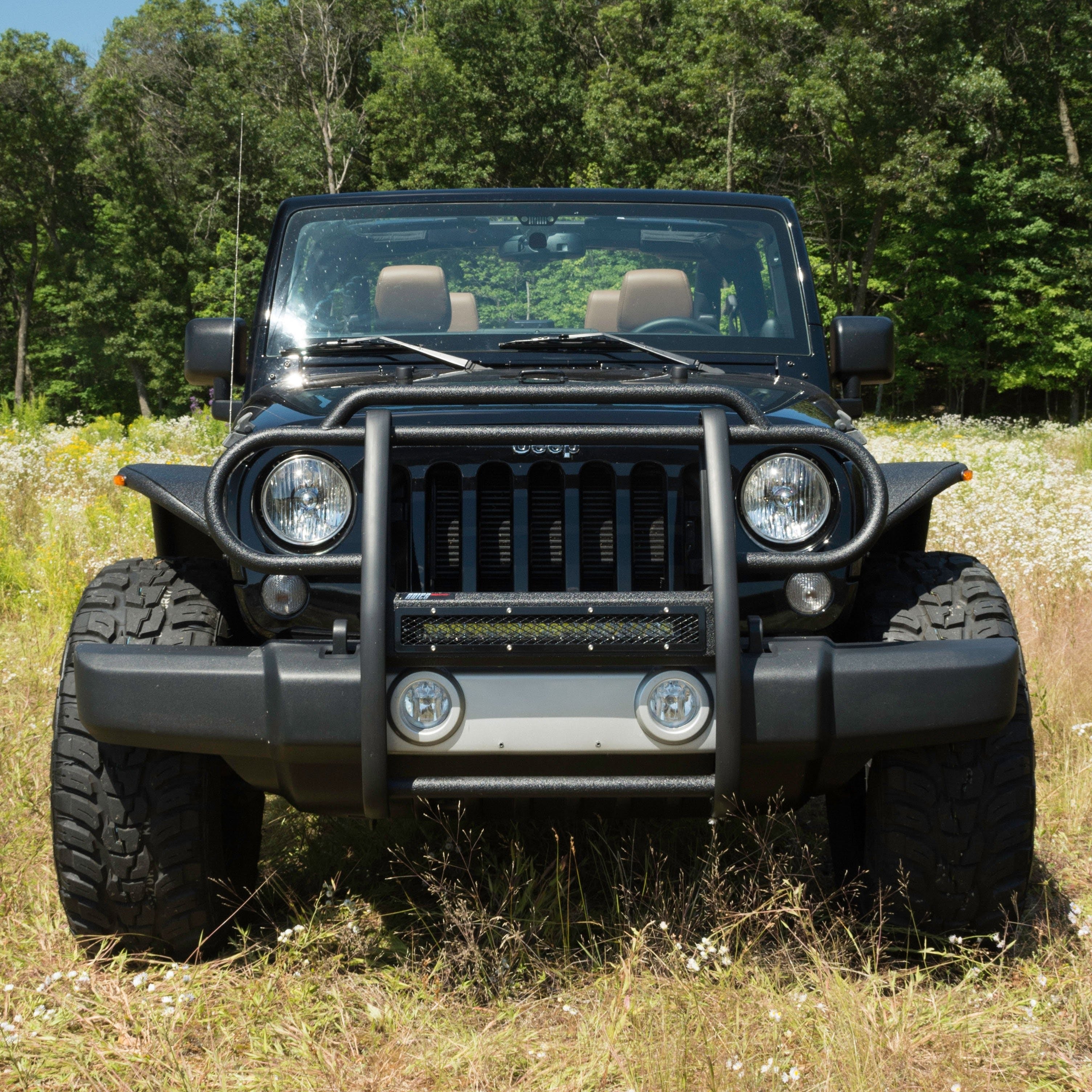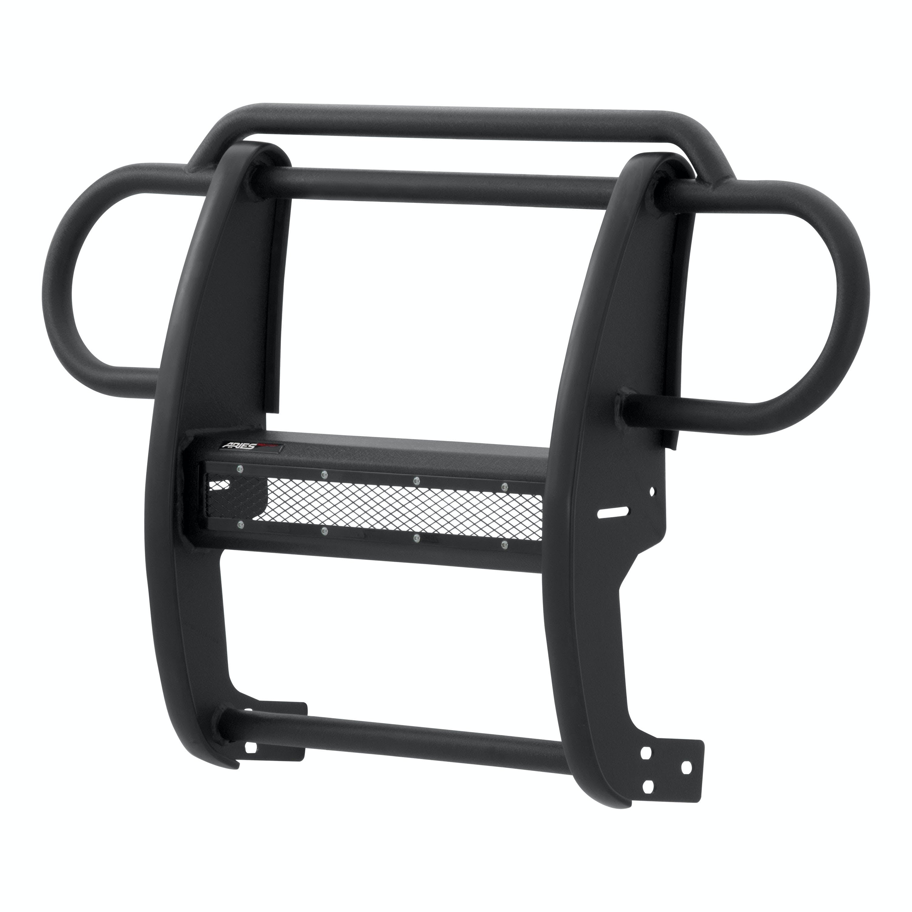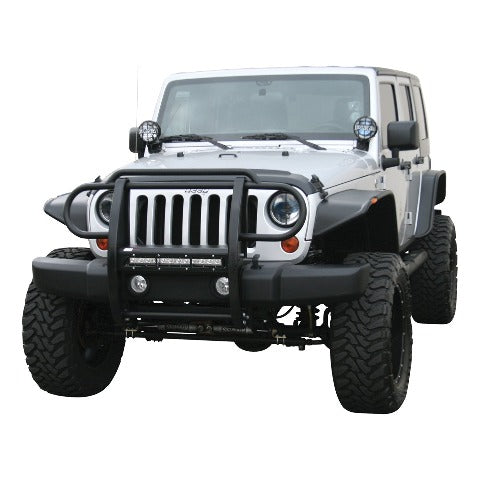 The ARIES Pro Series grille guard is unlike any other grille guard or brush guard on the road today because of its patented center crossbar. The ARIES Pro Series grille guard has a unique center crossbar that houses an LED light bar, allowing you to truly set your Jeep Wrangler apart from all others. Rather than using a set of light clips or forcing you to drill holes into the frame, the aerodynamic crossbar of the Pro Series grille guard is the light bar housing itself. It uses a 20" slotted channel bracket to mount the included 20" LED light bar #1501262. The bracket can also accept other single-row light bars (some 20" light bars may not fit). The crossbar mount can also articulate, allowing you to position the light beam at any angle you prefer. Integrating the channel mount into the crossbar housing also keeps the light bar protected from the elements. To further stylize your Jeep, this Pro Series grille guard also comes with an interchangeable grille guard cover plate. Included with each grille guard is a black mesh cover plate that easily bolts on and provides added security for your aftermarket lights. The mesh cover plate can be swapped out with other cover plate options, including five different styles and two finishes. Solid construction should be an essential feature of any grille guard, and the Pro Series grille guard is more than qualified. It has a one-piece design of 1/4" thick welded plates and 1-1/2" mandrel-bent carbon steel tubing. We also finish each Pro Series grille guard in a highly durable, dual-layer E-coat and textured black powder coat, giving it resilience to rust and scratches. ARIES Pro Series grille guards are made vehicle-specific for seamless integration with the factory bumper and an easy, no-drill installation. This grille guard fits select model years of the Jeep Wrangler JK (see application info to verify fitment).