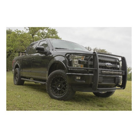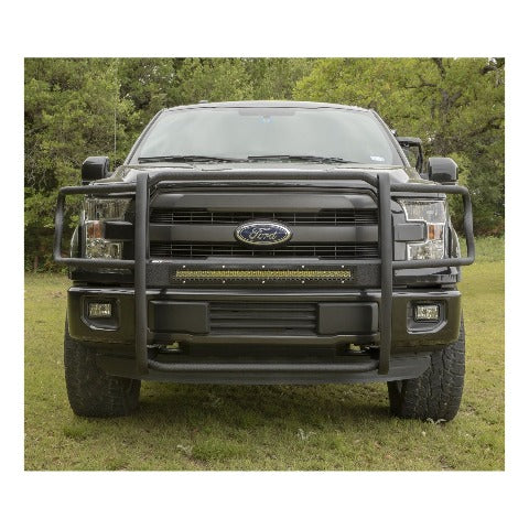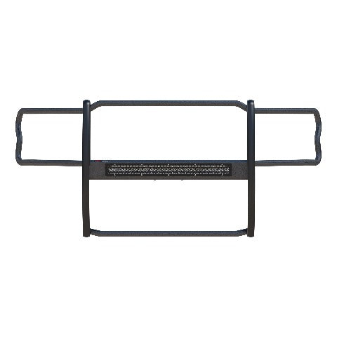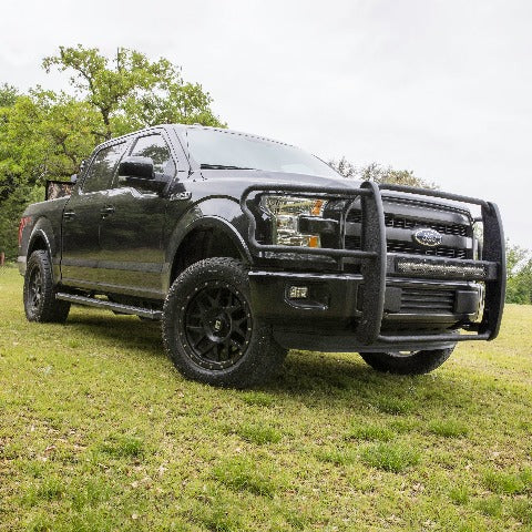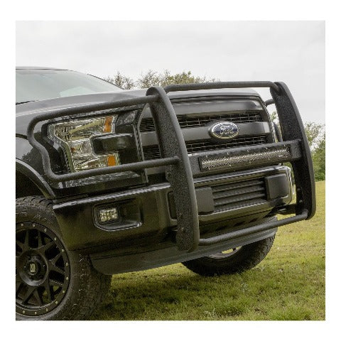 The ARIES Pro Series grille guard is unlike any other grille guard or brush guard on the road today because of its patented center crossbar. The ARIES Pro Series grille guard has a unique center crossbar that houses an LED light bar, allowing you to truly set your truck apart from all others. Rather than using a set of light clips or forcing you to drill holes into the frame, the aerodynamic crossbar of the Pro Series grille guard is the light bar housing itself. It uses a 30" slotted channel bracket to mount the included 30" LED light bar #1501264. The bracket can also accept other single-row light bars (some 30" light bars may not fit). The crossbar mount can also articulate, allowing you to position the light beam at any angle you prefer. Integrating the channel mount into the crossbar housing also keeps the light bar protected from the elements. To further stylize your truck, the Pro Series grille guard also comes with an interchangeable grille guard cover plate. Included with each grille guard is a black mesh cover plate that easily bolts on and provides added security for your aftermarket lights. The mesh cover plate can be swapped out with other cover plate options, including five different styles and two finishes. Solid construction should be an essential feature of any grille guard, and the Pro Series grille guard is more than qualified. It has a one-piece design of 1/4" thick welded plates and 1-1/2" mandrel-bent carbon steel tubing. We also finish each Pro Series grille guard in a highly durable, dual-layer E-coat and textured black powder coat, giving it resilience to rust and scratches. This unique finish also helps hide minor scratches and grime to maintain a clean look. ARIES Pro Series grille guards are made vehicle-specific for seamless integration with the factory bumper and an easy, no-drill installation. This grille guard fits select model years of the Ford F-150 (see application info to verify fitment).