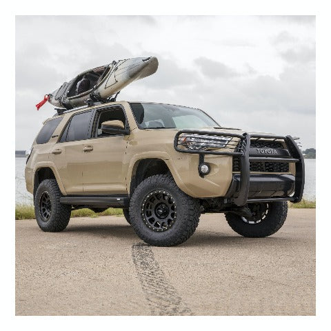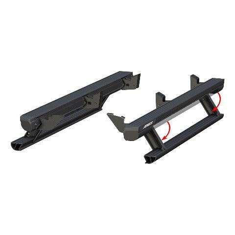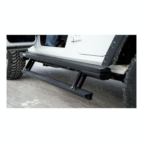 ARIES ActionTrac powered running boards are unique from other power side steps because they are actually two steps in one. This patented step-within-a-step design -- combined with a no-drill bracket installation, control module operation and powder-coated aluminum construction -- truly makes these retractable running boards an asset for the offroad truck or Jeep, particularly as lifted truck steps. ActionTrac powered running boards have one 4" wide step on top of the main housing and one 3" wide that automatically deploys as needed. When the door opens, the control module deploys the power step 8" below the main step, 15" below the doorsill, depending on the model. This two-step design offers enhanced safety and easier vehicle entry and exit, especially on large, lifted vehicles. It's also very helpful for families with young children and for elderly passengers. The boards contour to the vehicle and offer extra protection for the rocker panels from small road debris. For additional safety, the module is able to detect any obstructions during operation to avoid pinch hazards. LED lights are also built into the housing to illuminate the steps when deployed. ARIES ActionTrac powered running boards are made for vehicle-specific installation for a custom fit. They use pre-existing factory holes for the brackets to eliminate drilling. They also do not require any splicing into factory wiring. These particular running boards fit specific years of the Toyota 4Runner (see application info to verify fitment). Each set is constructed from powder-coated aluminum to be strong, lightweight and non-corrosive. The quiet, maintenance-free rotary motor is shielded within the main housing, along with the power step pivot points and all electrical components, protecting them from the harsh elements. NOTE: Boards, brackets and wiring are included.