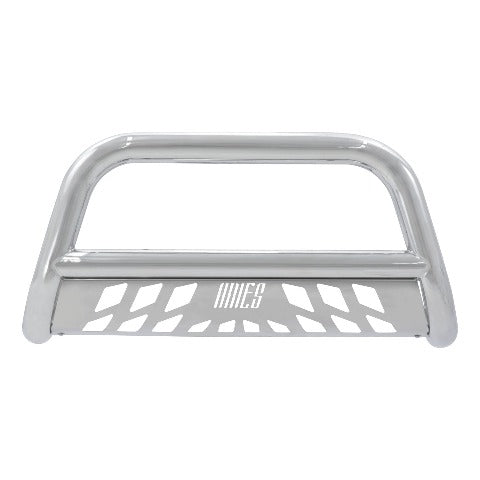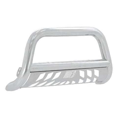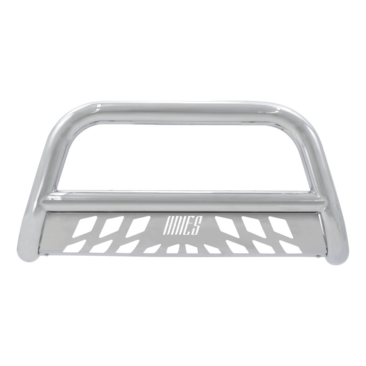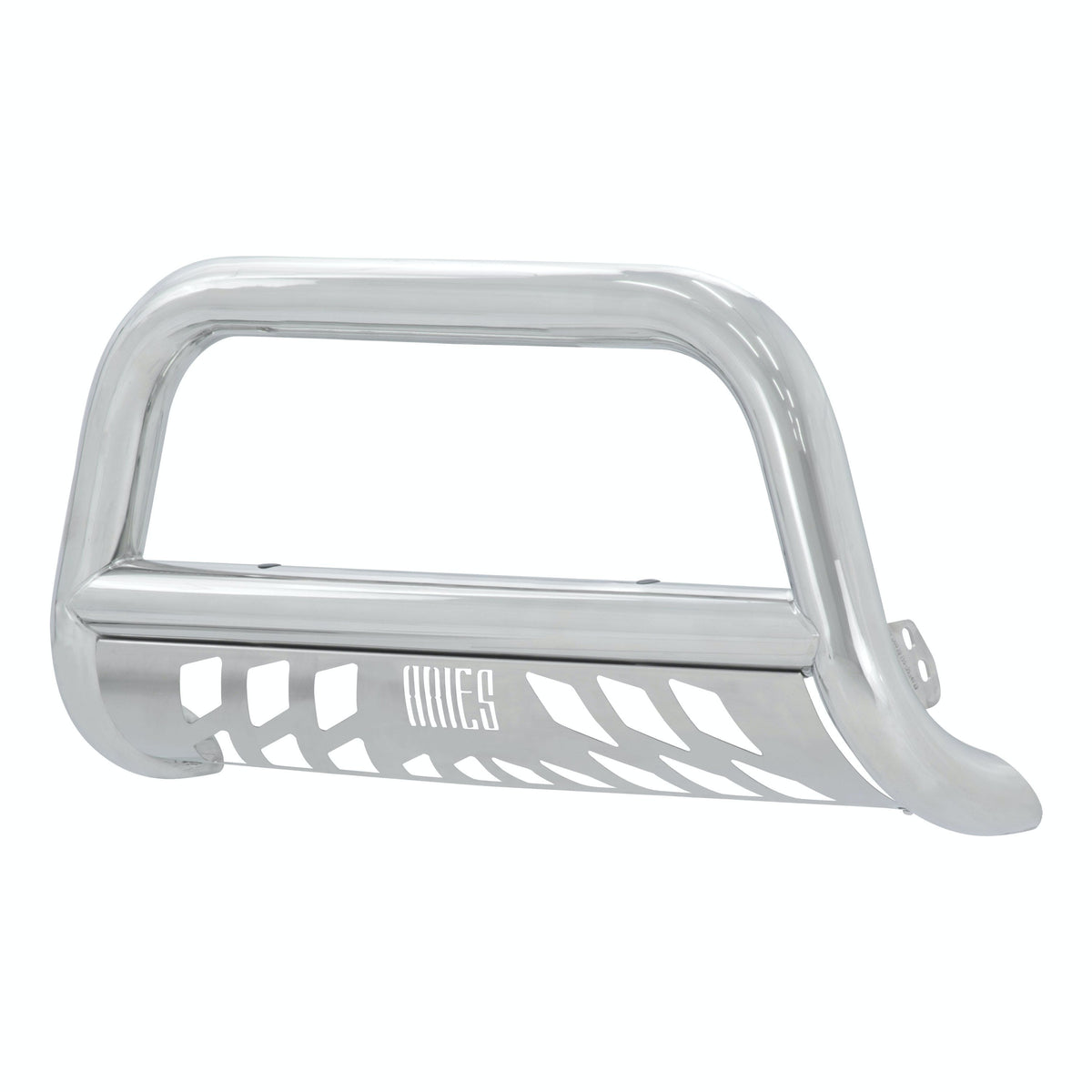 The ARIES 3" bull bar is made for those who face the uncertain road without fear. This particular model is constructed from 304 stainless steel. 304 stainless is high in nickel content, allowing the bull bar to easily resist water, road salt and rust and maintain its mirror-like polished finish in spite of the elements. Other available finishes include high-gloss black stainless steel, textured black steel and semi-gloss black steel. Customizing the look of your vehicle is simple with the ARIES 3" bull bar. It is equipped with pre-drilled light mounting holes and a removable skid plate. The center crossbar features two pre-drilled holes that readily accept an LED light bar or two LED work lights. The skid plate is made from 304 stainless steel and has a brushed finish to stop rust and hide scratches and scuffs. It also features an aggressive, ARIES-exclusive cutout pattern and can be removed for a customized look. Each ARIES 3" bull bar is made a vehicle-specific design, meaning that for each make and model, the bull bar has a custom bend and unique mounting brackets. This allows for the best possible fit on your vehicle and ensures solid attachment. The brackets also use pre-existing factory holes in the vehicle's frame to eliminate drilling, speed up installation and increase rigidity. This bull bar fits select model years of the Chevrolet Silverado 2500 HD or 3500 HD and GMC Sierra 2500 HD or 3500 HD (see application info to verify fitment).