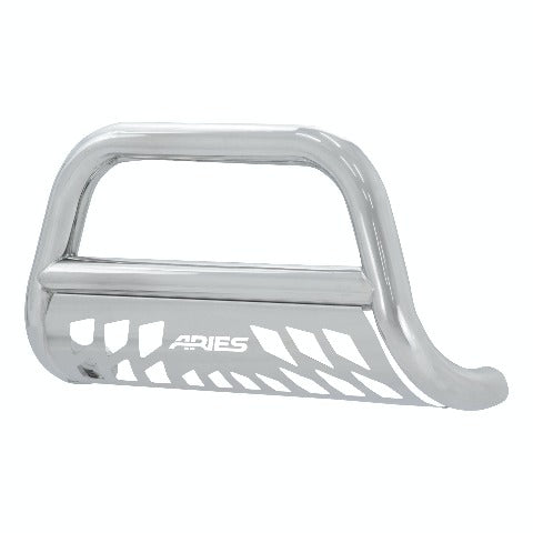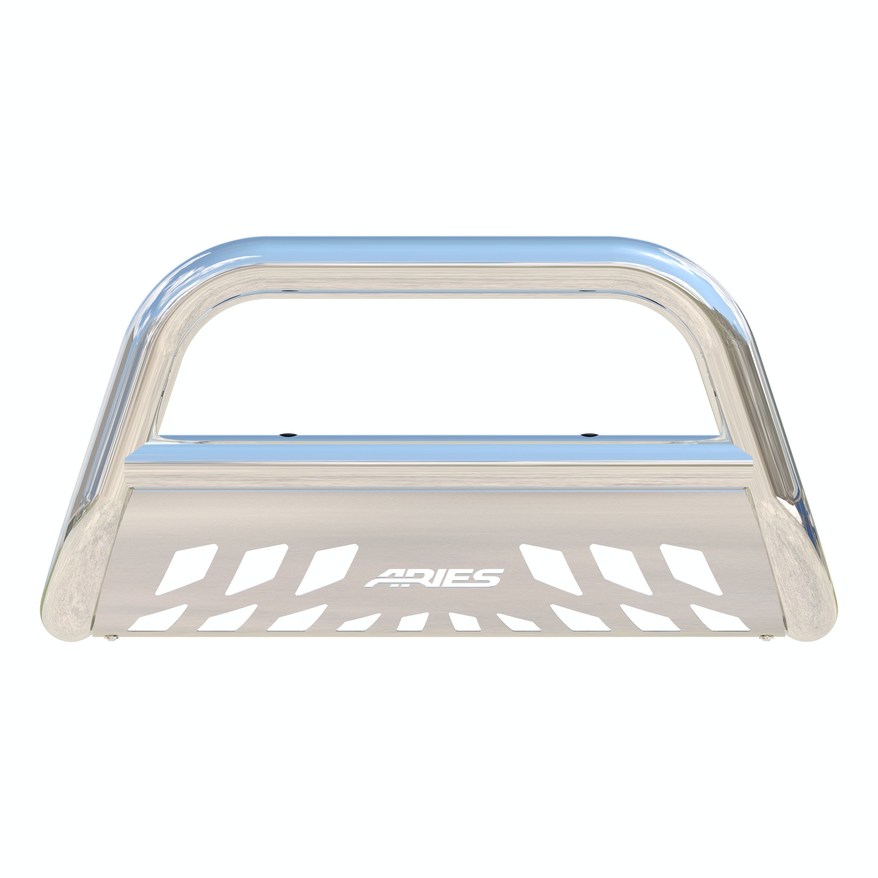The ARIES 3" bull bar is made for those who face the uncertain road without fear. This particular model is constructed from 304 stainless steel. 304 stainless is high in nickel content, allowing the bull bar to easily resist water, road salt and rust and maintain its mirror-like polished finish in spite of the elements. Other available finishes include high-gloss black stainless steel, textured black steel and semi-gloss black steel. Customizing the look of your vehicle is simple with the ARIES 3" bull bar. It is equipped with pre-drilled light mounting holes and a removable skid plate. The center crossbar features two pre-drilled holes that readily accept an LED light bar or two LED work lights. The skid plate is made from 304 stainless steel and has a brushed finish to stop rust and hide scratches and scuffs. It also features an aggressive, ARIES-exclusive cutout pattern and can be removed for a customized look. Each ARIES 3" bull bar is made a vehicle-specific design, meaning that for each make and model, the bull bar has a custom bend and unique mounting brackets. This allows for the best possible fit on your vehicle and ensures solid attachment. The brackets also use pre-existing factory holes in the vehicle's frame to eliminate drilling, speed up installation and increase rigidity. This bull bar fits select model years of the Cadillac Escalade, ESV and EXT, Chevrolet Avalanche, Silverado 1500, Suburban and Tahoe, GMC Sierra 1500, Yukon and Yukon XL (see application info to verify fitment).