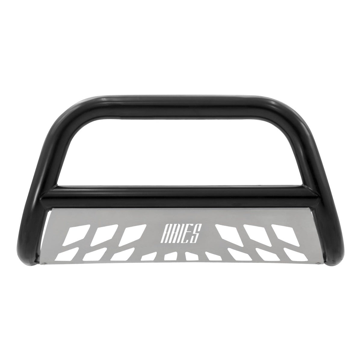 The ARIES 3" bull bar is made for those who face the uncertain road without fear. This particular model is constructed from strong carbon steel and finished in a durable E-coat and semi-gloss black powder coat finish to outlast rust and the elements. Other available finishes include high-gloss black stainless steel, polished stainless steel and textured black steel. Customizing the look of your vehicle is simple with the ARIES 3" bull bar. It is equipped with pre-drilled light mounting holes and a removable skid plate. The center crossbar features two pre-drilled holes that readily accept an LED light bar or two LED work lights. The skid plate is made from 304 stainless steel and has a brushed finish to stop rust and hide scratches and scuffs. It also features an aggressive, ARIES-exclusive cutout pattern and can be removed for a customized look. Each ARIES 3" bull bar is made a vehicle-specific design, meaning that for each make and model, the bull bar has a custom bend and unique mounting brackets. This allows for the best possible fit on your vehicle and ensures solid attachment. The brackets also use pre-existing factory holes in the vehicle's frame to eliminate drilling, speed up installation and increase rigidity. This bull bar fits select model years of the Ram 1500, Ram 1500 Classic and Dodge Ram 1500 (see application info to verify fitment).