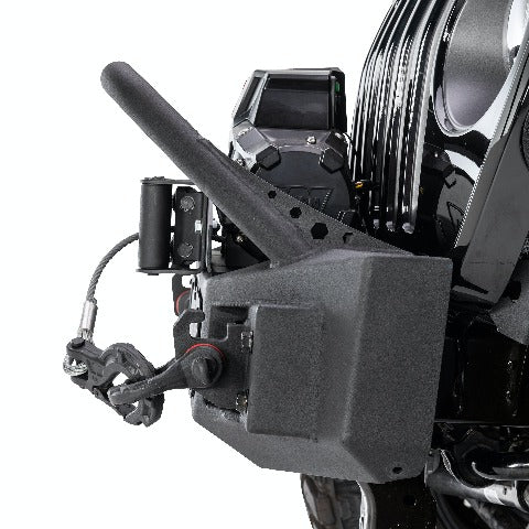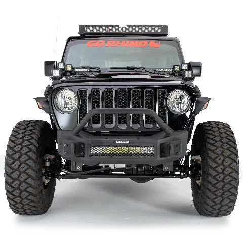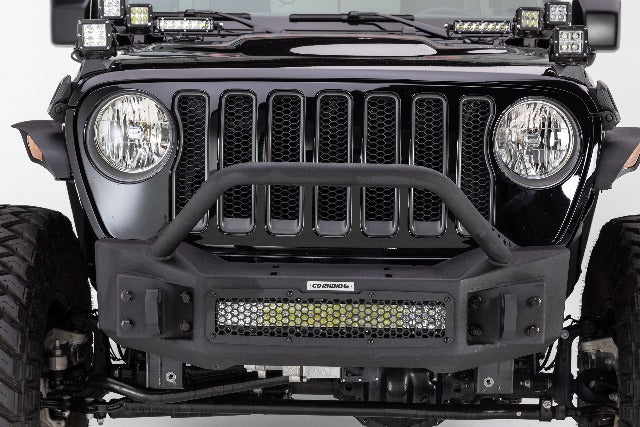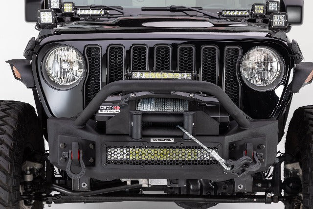 Rockline Winch Ready Front Stubby Bumper for Jeep JK, JL and JT with signature hex mesh LED protective cover for use with industry standard 20" double row LED bar or up to 4 standard 3" cube LED's & a fully welded over rider light mount bar