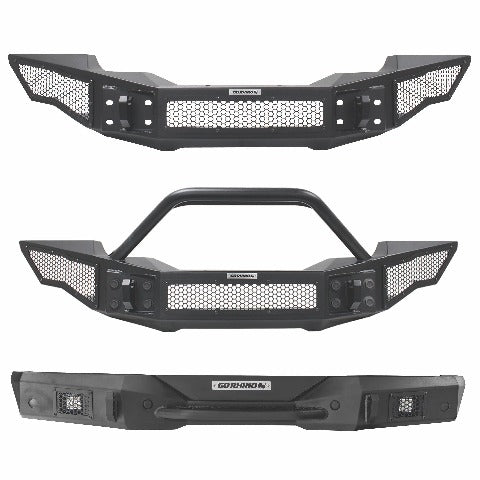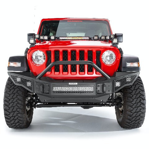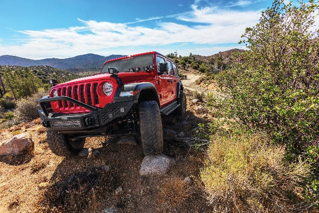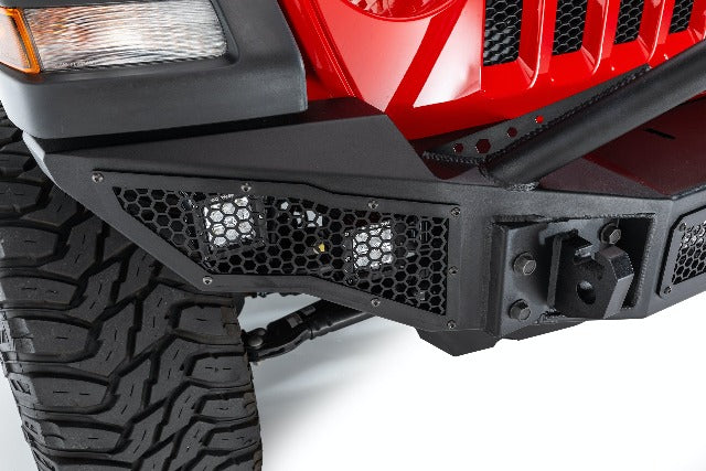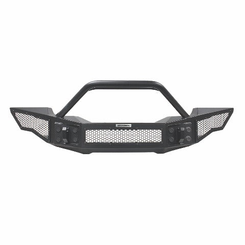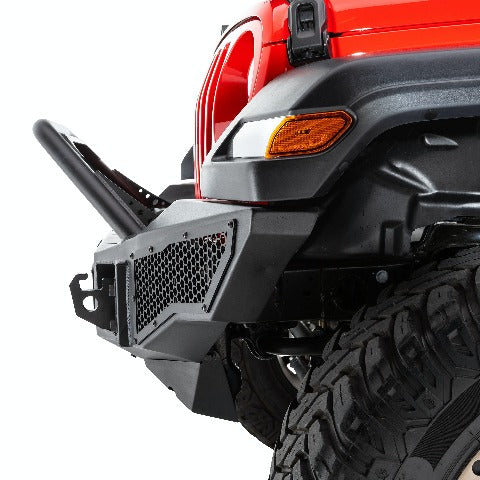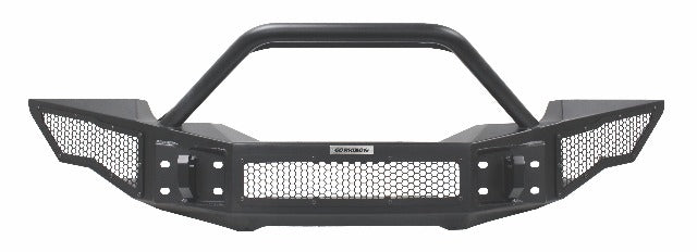 Wrangler JK, JL and JT Rockline Winch Ready Front Full Width Bumper w/Overrider bar & hex mesh LED protective cover for use with either an industry standard 20" double row LED bar or up to 4" cube LED's. Includes patented Rhino Hook D-Ring mounts