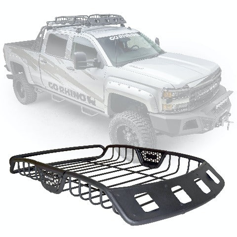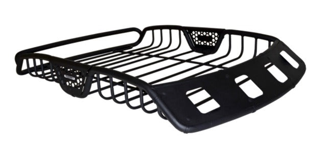 LR4 Safari Rack. 60" Long. Installs over factory or aftermarket cross bars. Side plate features tie down points to secure load. Ideal for use with luggage bags or straps. Tubular, mild steel construction. (4) Light ready deflector. Black textured powder c
