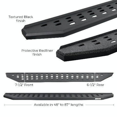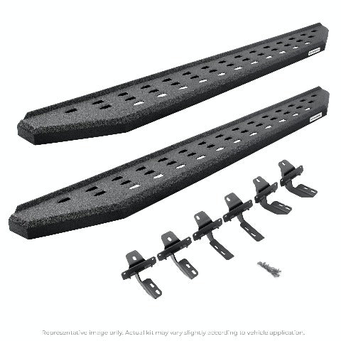 RB20 Running Boards offer off road styling while also helping to protect vehicle finish while providing a wide, full-length step platform for easy entry to vehicle. Built from 16-gauge zinc coated steel and coated for corrosion resistance.