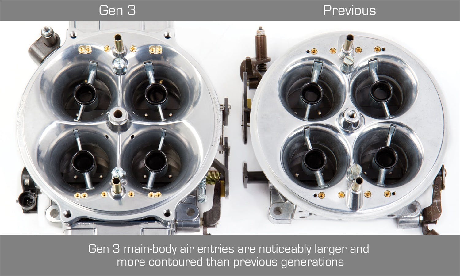 The Gen 3 utilizes high capacity fuel bowls which feature 20% more fuel capacity to eliminate starvation, integrated fuel shelf to minimize fuel aeration and internal baffling to control fuel slosh. Other features include all aluminum construction, 12 hole billet booster inserts, fully tunable billet metering blocks, adjustable external linkage, throttle position sensor mounting points and knurled (hand adjustable) curb idle screws Each calibration has been dyno and track tested to deliver proven performance!