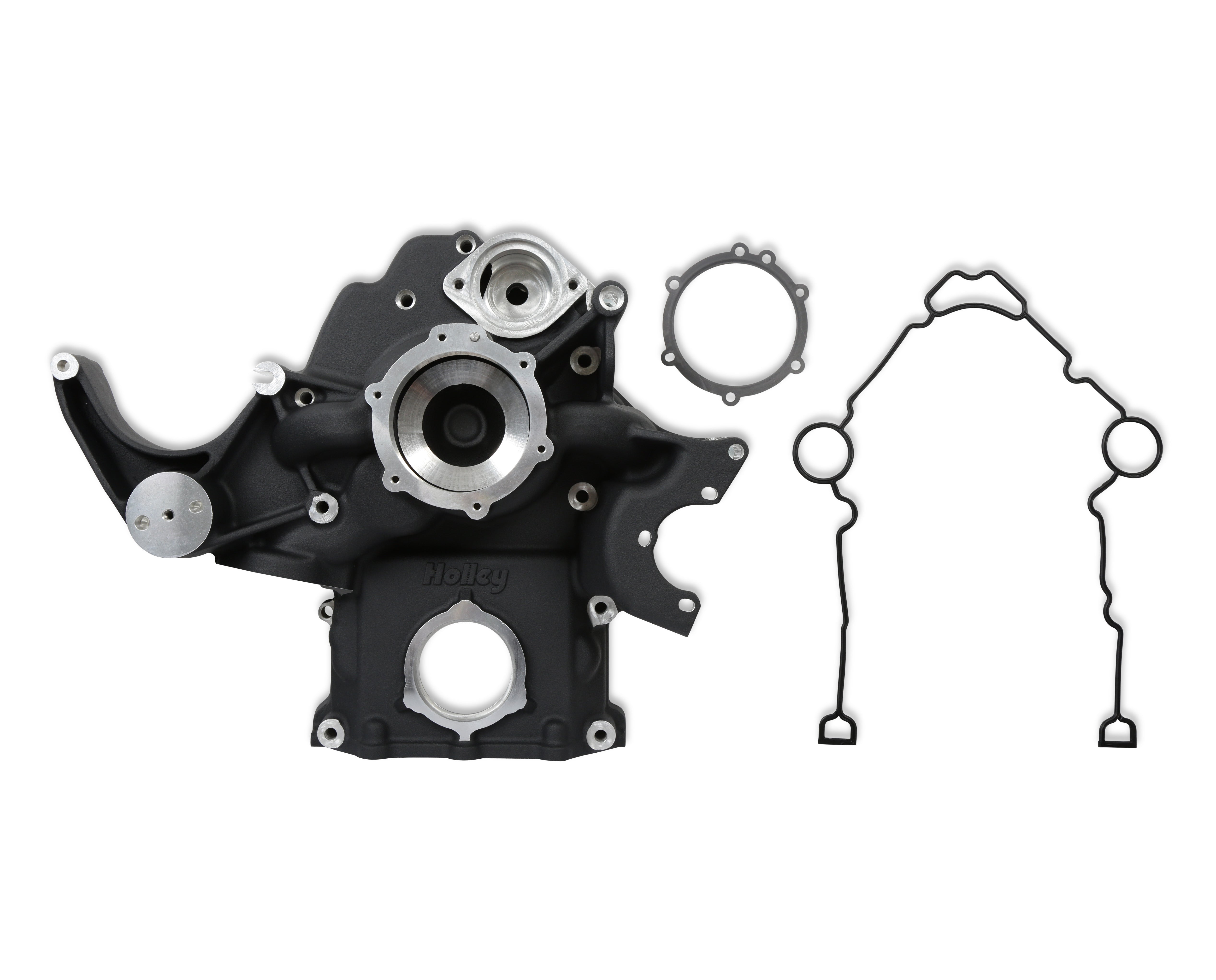 COMP MID-MT ACC SYSTEM, HEMI NO-VVT-BLAC;Optional A/C pulley cover (97-185) and Alternator pulley cover (97-187) are available separately.;Hemi Drive; hemi drive; hemi accessory drive; gen III hemi drive;Holley Black Mid-Mount Complete Accessory System;Gen III Hemi Engine - Non VVT - Fits 2003-2008 5.7L & 2005-2010 6.1L Engines -Black Finish - Factory Style Damper;Holley's complete, mid-mount accessory system has all accessories pulled in tighter than other accessory drives. At the heart of the system is a "bracketless" design (patent pending), where the accessories bolt directly to the timing cover for a clean, integrated system. The design offers superb engine visibility to show off your horsepower, not your accessories. Among the many swap friendly features are two optional heater connection configurations. The innovative Holley premium alternator incorporates 6-phase and square wire technology. The compact and reliable SD7 A/C compressor and Type II P/S pump with baffled reservoir are also integrated. The kit utilizes Holley's proven cartridge style water pump. When we say "complete", we mean complete. The Mid-Mount system comes with everything you need. All accessories are included; the water pump, A/C compressor, Alternator, P/S pump with reservoir, and the crank damper. All pulleys and the belt are supplied. Even heater hose adapters, power steering to -6 AN hardline, and the alternator plug/harness are included. Easy assembly was a priority during the entire development of this accessory solution. Color graphical instructions walk you through every step of the ultra-easy installation. This accessory drive system fits following Non-VVT Engines: 2003-2008 5.7L 2005-2010 6.1L 2007-2010 392 Mopar Crate Engine;Bracketless Accessory Mounting System for Ultra-Easy Assembly – Timing Cover is Integrated into this Bracket / Casting;Configurable Heater Hose Connection Options - for Hose Routing Flexibility;Holley Premium 150 Amp alternator – Plenty of Power for All Vehicle Systems;Easy Wiring of Alternator That Doesn’t Require Factory ECU to Excite Alternator;Alternator is Tucked in Tight to the Engine – Eliminates Frame Rail or Hood Clearance Issues (Common with Factory Car or Truck Drive Systems);Holley Water Pump w/ Cartridge Design – Compact & Easy to Service Without Removing the Water Pump Housing / Timing Cover;SD7 A/C Compressor – Small Compact Compressor;Type II Power Steering Pump with Baffled Reservoir;Power Steering Pump Has Proper Pressure for use with Steering Box on Older Vehicles (Eliminates Steering Box Damage Due to Excessive Pressure);Swivel Water Inlet & Outlet – Allows Custom Radiator Hose Routing;OE (Original Equipment) Pulley Ratios for Optimal Accessory Performance;No Adapters or Spacers Needed – for Easy Installation;Works with Common After-Market and Factory Throttle Bodies and Intakes;Choose from Kits in Natural Aluminum or Black Finish – Fits Naturally Aspirated Gen III Hemi Engines (5.7L, 6.1L, and 6.4L);Includes OE Style Damper with Cast in Serpentine Pulley;All Accessories are Included; Water Pump, A/C Compressor, Alternator, Power Steering Pump w/ Reservoir, Pulleys & Crank Damper;All Plumbing Adapters, Wiring Adapters, Gaskets and Seals are Included;Available for VVT (Variable Valve Timing – 2009-Up 5.7L and 2011-Up 6.4L) and Non-VVT (2003-2008 5.7L, and 2005-2010 6.1L) Engines in Natural Cast Aluminum or Black Finish