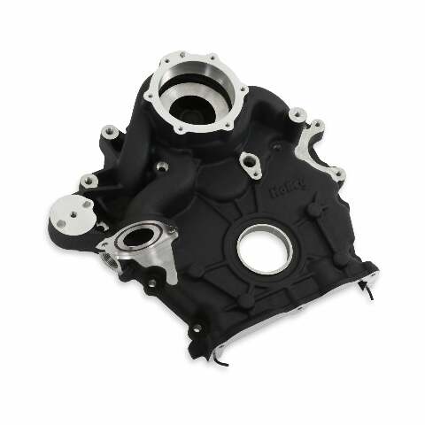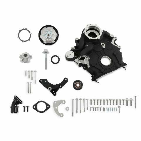 ACC DRV BASE KIT FOR OE OIL PAN-GDZ-BLAC;Godzilla High-Mount Base Accessory Drive Kit - Black Finish;Includes Timing Cover/Water Manifold, Water Pump, and Alternator Bracket;Holley's high-mount accessory drive has everything pulled up and in tighter than other options. The patent pending accessory drive incorporates the timing cover, water pump, and alternator and can also be configured with A/C and/or P/S if desired. This system works with the factory crank pulley, as well as aftermarket damper/pulleys. The accessory drive components in this system can be configured in several different ways. For example, there are alternator options available for different performance and electrical demands. Also, deleting the A/C and/or P/S are options . This "base kit" supplies all but the components with options. If you purchase a "Holley complete kit," all these options are already chosen for the most common, cost-effective combination.;This high-mount accessory drive has all accessories pulled up and in tighter than other options;Fits Ford 7.3-liter Godzilla engine – ideal for engine swaps;Provides additional accessory clearance for swap applications that work with the factory rear sump oil pan;Allows for A/C and/or P/S delete and choice of alternator;Includes new front main seal and installation tool;Works with the original factory crank pulley, as well as aftermarket damper/pulleys;Alternator options do not require the original ECU control to function;P/S pump with the optional external reservoir is ideal for hydro-boost applications;Choose from natural "as-cast" or black finish on the timing cover