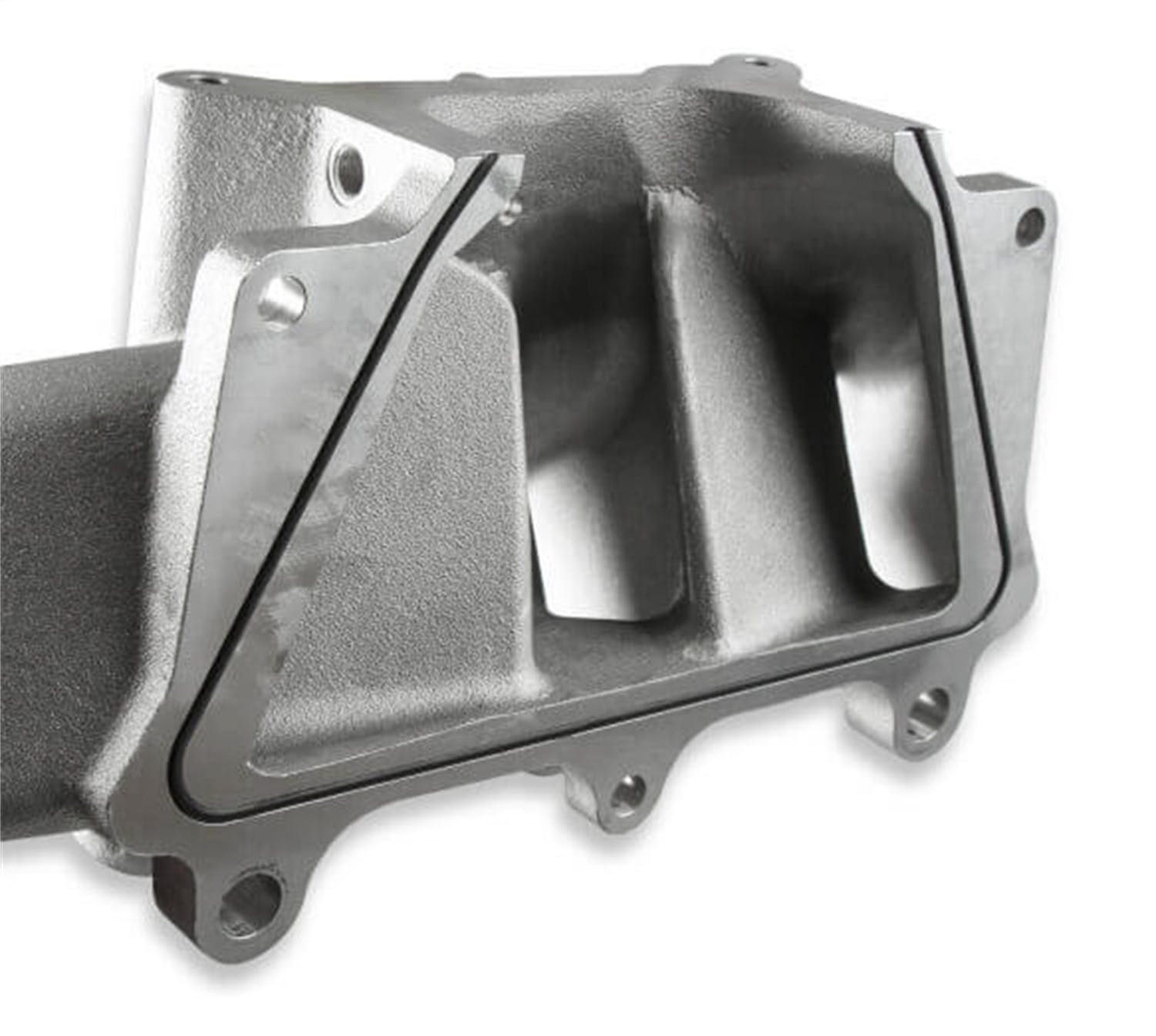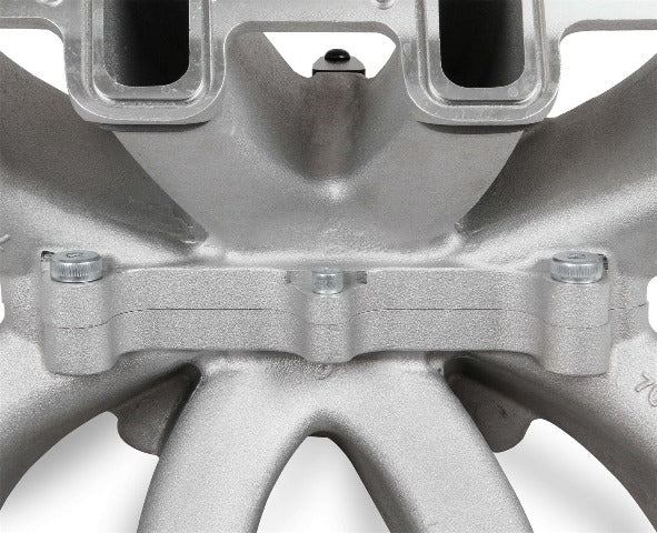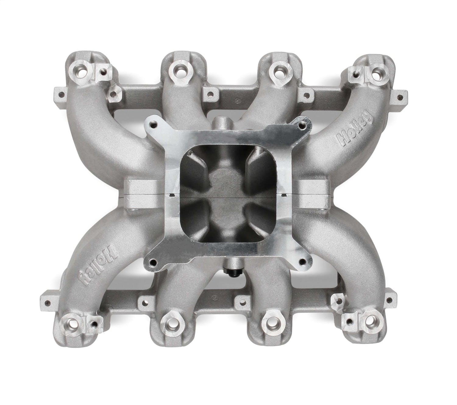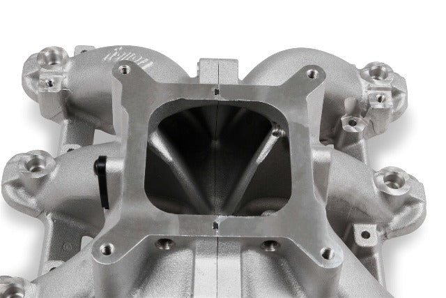 The new single plane intake manifold is designed to provide a broad RPM powerband for high-performance street/strip engine applications to a maximum engine speed of 7500 RPM. The carburetor-mounting pad is designed to accept all stock or aftermarket square-bore carburetors with manual or electric chokes. These intake manifolds are designed to accept most stock hardware and accessory brackets, but offer performance features; like an updated plenum divider area, a 1 shorter height than the 300-25 manifold, and a choice of two distributor clamp locations. The isolated design of the air/fuel passages helps to increase charge air density and performance. The 300-261 intake manifolds are designed for square-bore carburetor applications on 1957-86 262-400cid Small Block Chevrolet engines and SBC engines equipped with 1987-91 L98 aluminum Corvette cylinder heads (non-EGR applications). Also, these manifolds will work with any SBC engine equipped with aftermarket cylinder heads, as long as they have a standard port flange opening and mounting bolt locations.