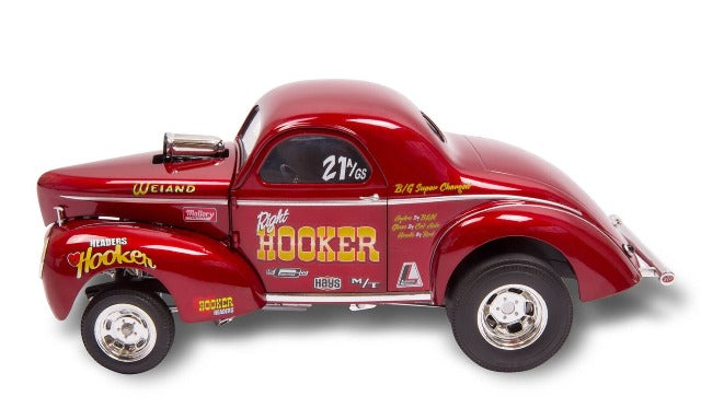 Holley is proud to release this Limited Edition 1/18 scale 1941 Willys Gasser. This model has been painstakingly reproduced and comes complete with a blown Hemi and race-ready paint and graphics. The model also features a fully detailed interior and undercarriage, opening doors, removable hood, cloth seatbelts, fully plumbed and wired engine, and poseable steering.