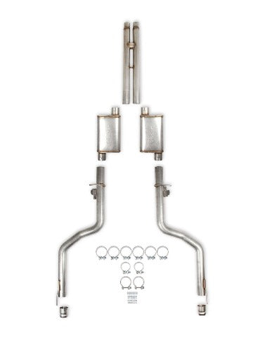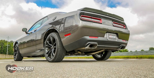 Hooker BlackHeart introduces their Cat-Back dual exhaust system for the 2017-2021 Dodge Challenger R/T and T/A models with the 5.7L engine and factory active valves. This system is designed with 3.0-inch mandrel bent 304 stainless steel material for excellent corrosion resistance and maximum exhaust flow for improved performance. The system uses pair high-flow mufflers that not only look good, but also provide an aggressive to moderate performance tone that will make your Challenger stand out from the crowd. This kit comes with active valve deletes to keep the check engine light off while you enjoy the sound of the exhaust all the time. The system uses the factory tips for a clean OEM appearance. All hardware is included and this system utilizes the factory mounting points for an OE type of fit and a simple installation.