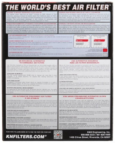 K&N washable, reusable High-Flow Air Filters feature a state-of-the-art design of layered, oiled cotton media engineered to improve airflow and capture contaminants, and are designed to provide an increase in horsepower. Each performance air filter is reusable, engineered to last for the entire lifespan of your vehicle, and backed by K&N's 10-Year/Million Mile Limited Warranty. K&N drop-in replacement filters are designed to install easily into your factory air box. Upgrade today and start enjoying superior airflow and superior performance from K&N's most popular product!