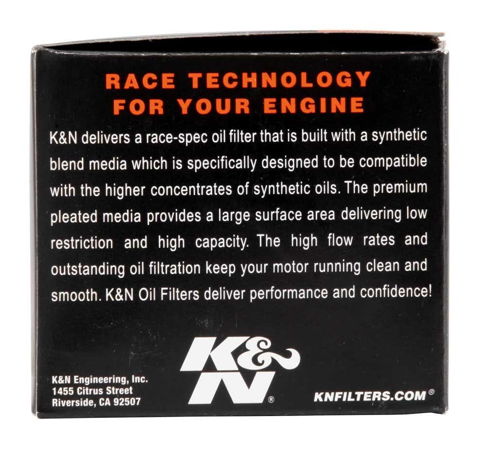 K&N Powersports Cartridge Oil Filters contain a modern synthetic filter media, designed for ultimate flow with less pressure drop. They also provide outstanding filtration to meet or exceed all OEM specifications.
