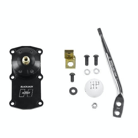 This Hurst Blackjack Shifter is specifically designed to locate the shifter handle in the proper location for all 1964-1966 Ford Mustang applications when using a Tremec TKO 5-speed transmission. Hurst Blackjack shifter housings are CNC machined from billet 6061 aluminum, feature a tough black MIL-Spec anodized finish with the Hurst logo CNC machined in the top plate, ensuring you're buying the highest quality shifter available today for your Tremec TKO transmission. Other features include a zinc-plated hardened chromoly steel stick adapter, dual stick centering springs, hardened Chromoly pivot pins and a durable delrin pivot ball for positive, quiet operation. Includes the classic Hurst chrome flat bar stick and white shift ball for the specified application.