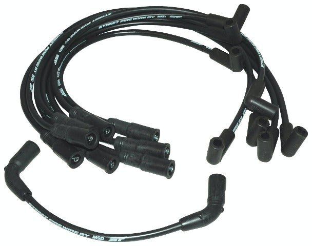 The street fire spark plug wires feature a low resistance conductor that's wrapped in a sleek and durable black sleeve. The terminals are covered in black boots that protect the conductor from engine heat to ensure spark delivery.
