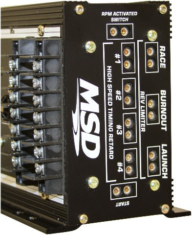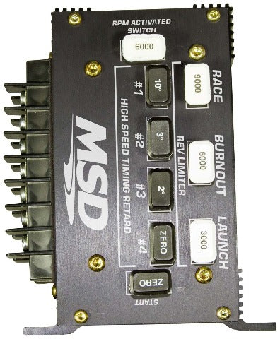 The MSD 7AL-3(TM) is based off the well proven MSD 7AL-2 plus. It features a host of the most popular drag racing accessories. A built-in three step rev control provides three different rpm limits that can be used for the burnout, hole shot and top end overrev protection. There is also a multi-step retard with four different modules that can be activated at different times. Four 0 degree modules and a 2 degrees, 3 degrees and 4 degrees module are supplied. Many race engines with crank trigger systems or locked-out distributors will benefit from the 7AL-3's built-in start retard option. during cranking the start retard will retard the timing 25 degrees allowing the engine to turn over easier. When the engine starts, the timing will automatically go back to its mechanical setting. One last option is an RPM activated switch that allows you to activate a solenoid or shift light at an adjustable rpm. When the engine hits the desired rpm the RAS circuit provides a ground to the component to activate it. Vibration mounts, wires and detailed instructions are supplied.