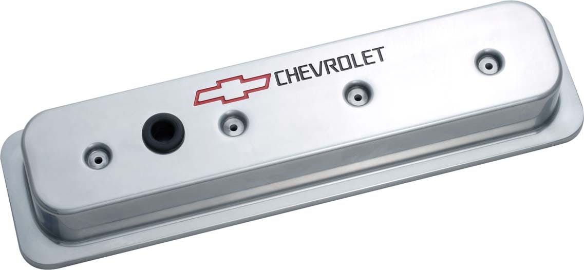 Engine Valve Cover; Baffled; Center Bolt Style; Polished Finish With Chevy and Bowtie Logos; Fits 1987 to 2000 305-350 Small Block Chevy Engines; Made From Quality Die Cast Material; Officially Licensed GM Product; Sold As One Pair