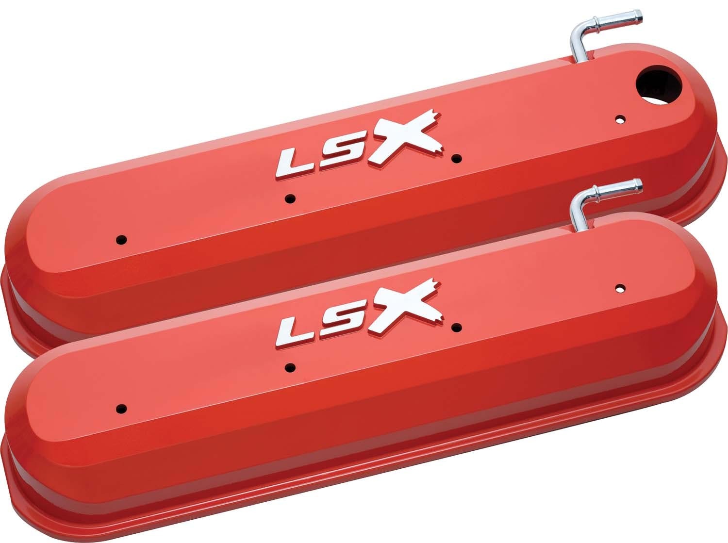 Engine Valve Cover; Slant-Edge Style With Baffles and Studs; Orange with LSX logo; Fits GM LS Series Engines; Made from Quality Die Cast Aluminum; Officially Licensed GM Product; Sold As One Pair