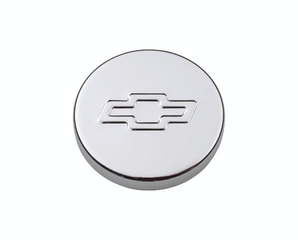 Engine Oil Filler Cap; Chrome Plated Finish; Made From High-Quality Steel; Features Chevy Bowtie Logo Embossed Into The Top; Universal Fit; Push-In Style; Fits 1.22 Inch Diameter Valve Cover Holes; Sold Each