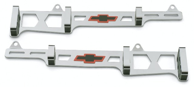 Spark Plug Wire Loom Set; Linear Style For 7mm-8mm wires; Mounts To Engine Valve Covers; Fits 1959 to 1986 Small Block Chevy Engines; Chrome Finish With Red/Black Bowtie Logo; Made From High-Quality Steel Material; Sold As One Pair