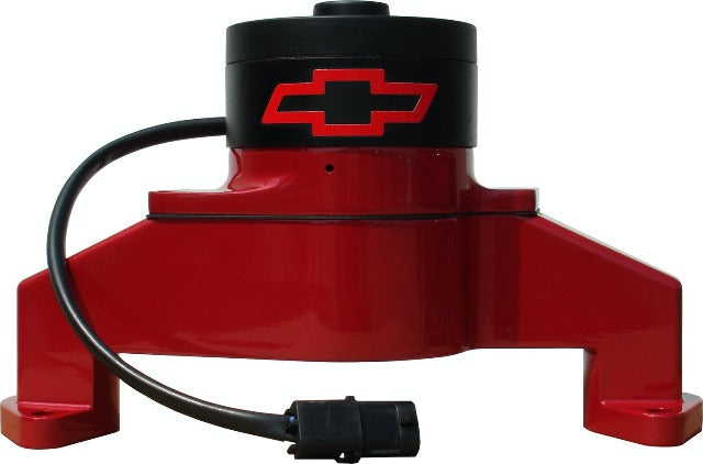 Electric Engine Water Pump; Fits BB Chevy Engines; Made From Die Cast Aluminum; Body Has A Red Finish and Motor Has Black Finish With Red Bowtie Logo; Flows 35 GPM; Billet 1.0 Inch NPT to 1-3/4 Inch Hose Fitting Included; Sold Individually