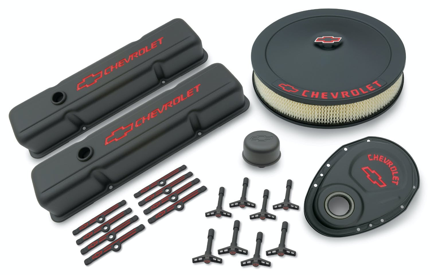 Engine Dress-Up Kit; Black Finish w/Red Chevy and Bowtie Logo; Steel Material; SB Chevy Engines; Includes Tall Baffled Valve Covers w/Wing Nuts and Hold-Downs, Timing Cover, 14in. Air Cleaner, 1 Push-In Breather; Sold As One Complete Kit