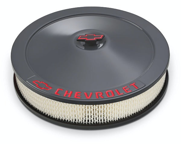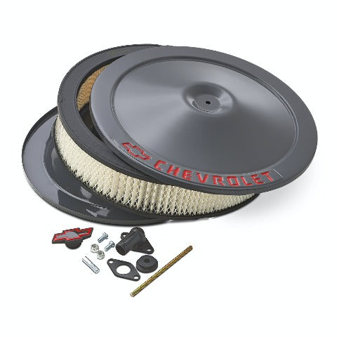 Carburetor Air Cleaner Kit; 14 Inch Diameter; Features Red 'Chevrolet' Lettering and Bowtie and Includes a Bowtie Center Nut ; Made From Steel; Shark Gray Finish; 3.750 Inch Installed Carb Height; Paper Filter Included; Sold As One Kit