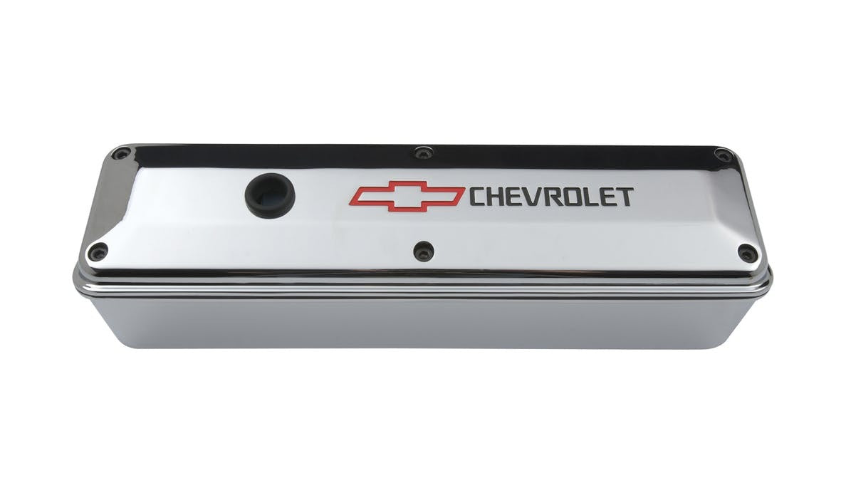 Engine Valve Cover; 2-Piece Tall Style; Chrome Plated Finish With Recessed Chevy and Bowtie Logos; Fits 1955 to 1986 262-400 Small Block Chevy Engines; Made From Quality Die Cast Material; Officially Licensed GM Product; Sold As One Pair