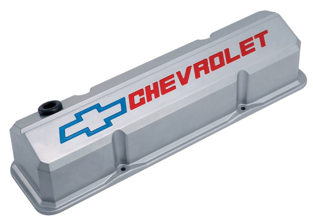 Engine Valve Cover; Slant-Edge Style Tall w/Baffles; Metallic Gray Finish With Recessed Chevy and Bowtie Logos; Fits 1955 to 1986 262-400 Small Block Chevy Engines; Made From Die Cast Aluminum; Officially Licensed GM Product; Sold As Pair