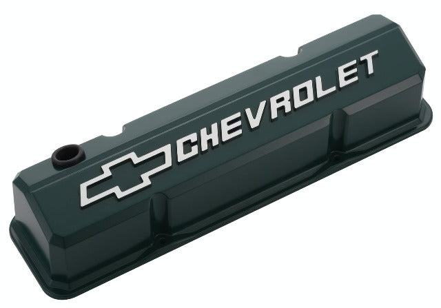 Engine Valve Cover; Slant-Edge Style With Baffles; Green Finish With Raised Chevy and Bowtie Logos; Fits 1955 to 1986 262-400 Small Block Chevy Engines; Made From Die Cast Aluminum; Officially Licensed GM Product; Sold As Pair
