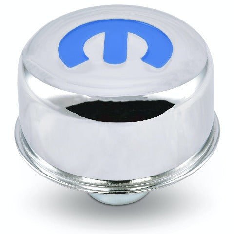 If you are looking for the classic look for your valve covers, look no further. This chrome finish breather cap has the Omega M recessed in blue, and comes with a grommet for exact fit. Made from quality stamped steel.