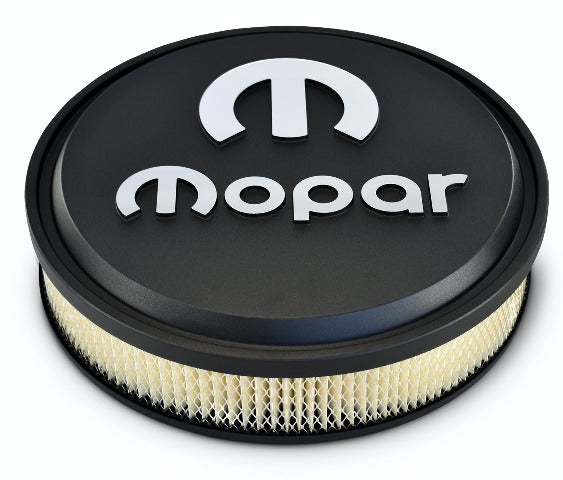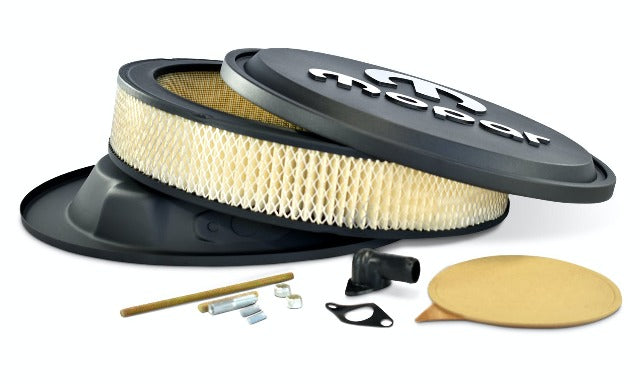 Slant-Edge Carburetor Air Cleaner Kit; 14 Inch Diameter; Features Raised and Machined MOPAR Emblem; Made From Die-cast Aluminum; Black Crinkle Finish; Paper Filter Included; Sold As One Kit.