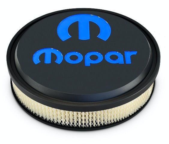 Slant-Edge Carburetor Air Cleaner Kit; 14 Inch Diameter; Features Recessed Blue MOPAR Emblem; Made From Die-cast Aluminum; Black Crinkle Finish; Paper Filter Included; Sold As One Kit.