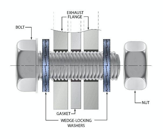 PROFORM Wedge-Locking Exhaust Collector Bolts ELIMINATE the need to constantly re-tighten collector bolts, and without the need for clips, pins, racing-wire, chemicals or gunk. The secret is in the Wedge-Locking Washer's super-hardened external teeth that bite into the bottom of the bolt head and the top flange surface. Vibrations that normally cause other bolts to loosen, are blocked by the wedge-locking action that uses tension, instead of friction to stay snug. In fact, contact with oil actually facilitates the effect. Installs/uninstalls with a normal wrench, lubricate, and then reuse. Each set comes with six Grade 8 bolts (3/8-16 thread, 1 long) with a black oxide finish, six nuts and six pairs of Wedge-Locking Washers.