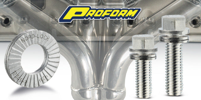PROFORM Wedge-Locking Header Bolts ELIMINATE the need to constantly re-tighten collector bolts, and without the need for clips, pins, racing-wire, chemicals or gunk. The secret is in the Wedge-Locking Washer's super-hardened external teeth that "bite" into the bottom of the bolt head and the top flange surface. Vibrations that normally cause other bolts to loosen, are blocked by the wedge-locking action that uses tension, instead of friction to stay snug. In fact, contact with oil actually facilitates the effect. Installs/uninstalls with a normal wrench, lubricate, and then reuse. Each set comes with twelve Hex Head, Grade 8 (12.9) steel bolts (3/8"-16 thread, 3/4" long) with a shiny nickel plated finish, and pre-assembled Wedge-Locking Washers.